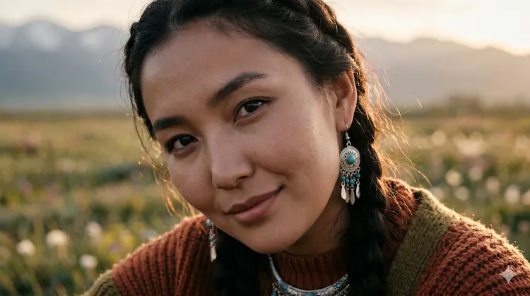 Одежда: Трикотажный джемпер (мягкая текстура) в теплых, терракотовых и оливковых тонах, сочетающийся с современными казахскими серебряными украшениями (например, серьга с орнаментом). Яркий, но не чрезмерный. Крупный план не позволяет показать весь костюм.