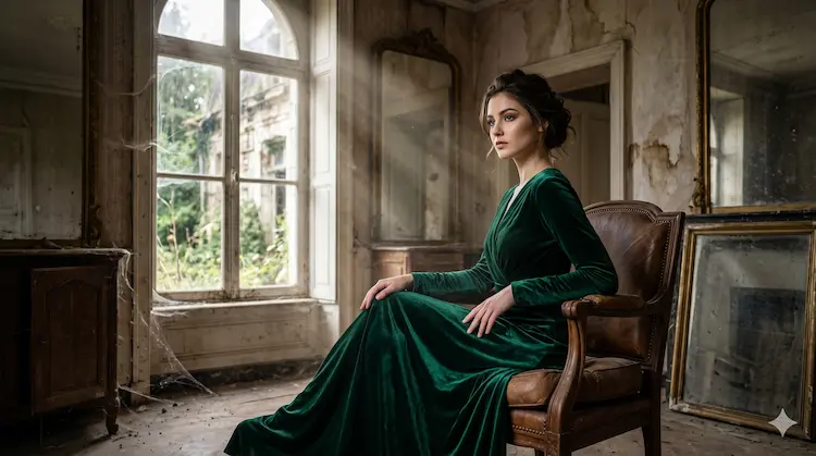 Одежда: Бархатное платье глубокого изумрудного цвета.