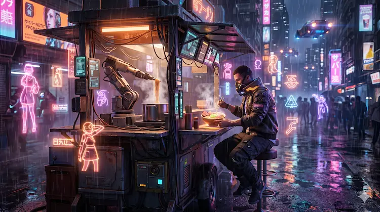 Сюжет: Высокотехнологичный уличный киоск, где ест одинокая фигура в технической одежде, окруженная неоновыми огнями и голограммами на дождливой улице.