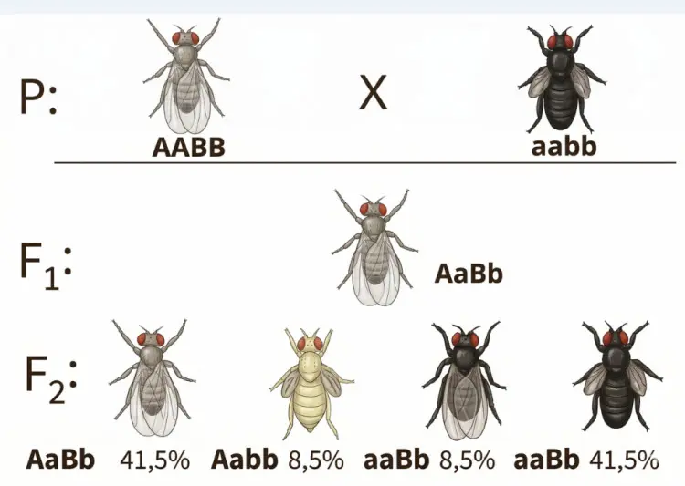 - 83% потомства (родительские классы): из них 41.5% — серое тело/нормальные крылья и 41.5% — черное тело/зачаточные крылья.