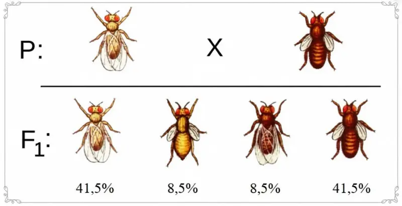 - 83% потомства (родительские классы): из них 41.5% — серое тело/нормальные крылья и 41.5% — черное тело/зачаточные крылья.