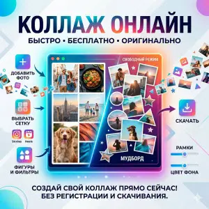 Ищете способ быстро и красиво объединить любимые снимки? Наш удобный инструмент позволяет сделать коллаж из фото прямо в браузере. Вам больше не нужно устанавливать тяжелые программы на телефон или компьютер. Если вы хотите создать стильный мудборд, подготовить пост для социальных сетей или просто сохранить воспоминания об отпуске — здесь вы можете собрать оригинальный фотоколлаж онлайн и совершенно бесплатно.